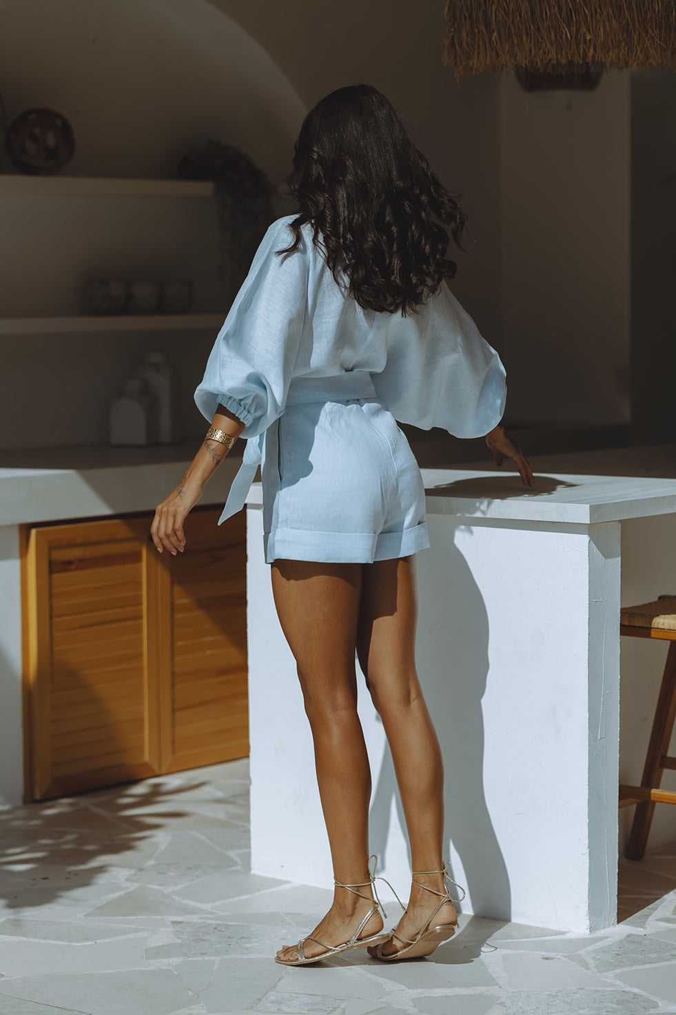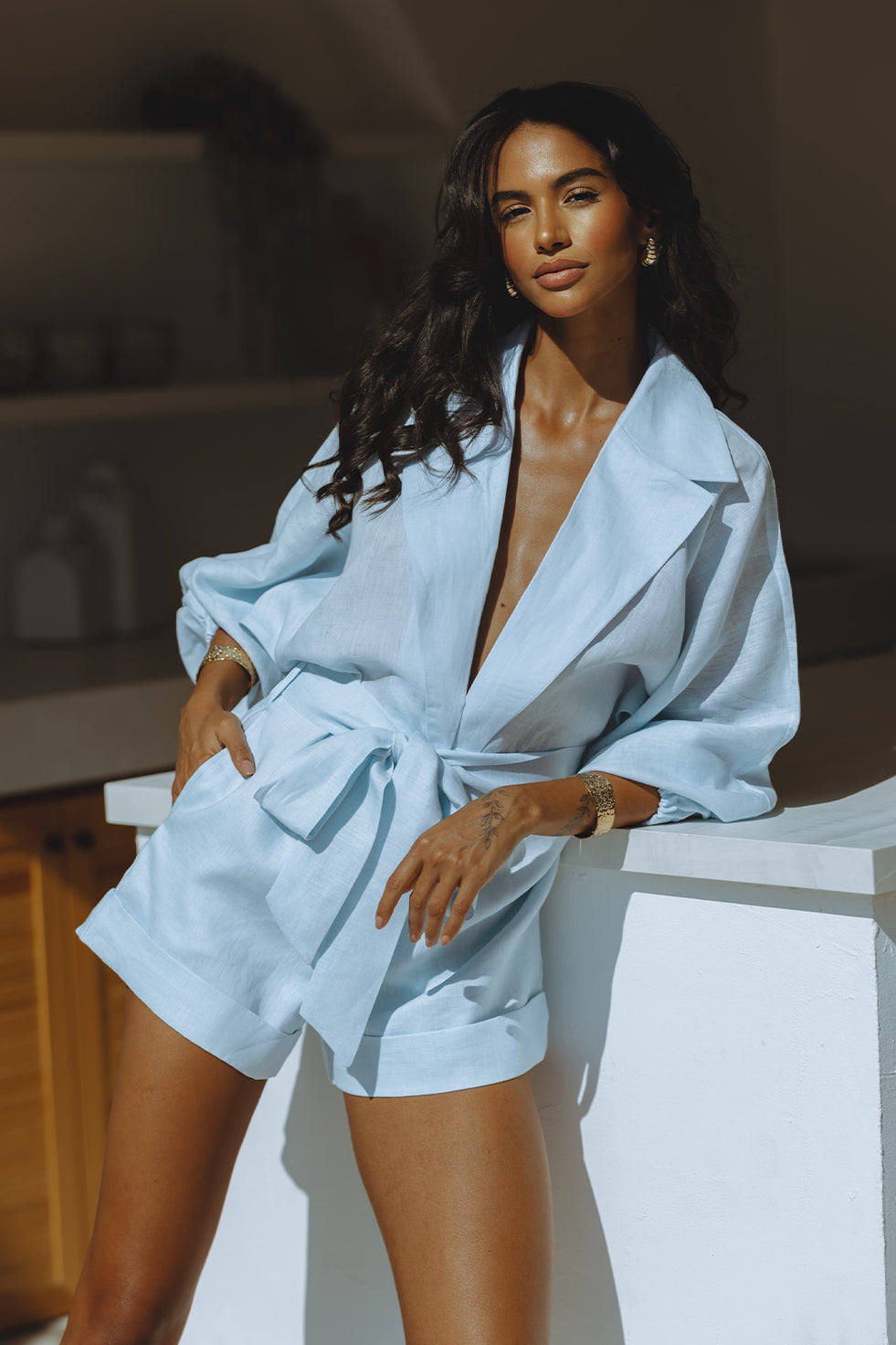 Breeze through warm days in the Maxie Linen Playsuit in Sky Blue, a dreamy blend of relaxed elegance and coastal cool. Cut from airy 100% linen, it features a plunging neckline, billowy sleeves, and a self-tie belt to define the waist. The tailored shorts keep it polished yet playful—perfect for sunlit brunches or barefoot strolls by the sea. A soft, sky-hued staple made for chasing endless summer moments.