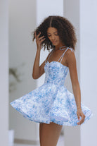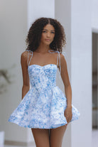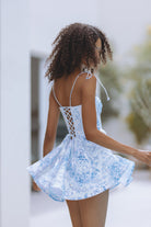 Flirty and feminine, the Olessia Corset Mini Dress in Azure Meadow features a sculpted bodice with delicate lace-up detailing and soft tie straps.