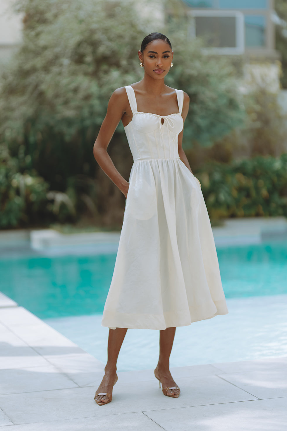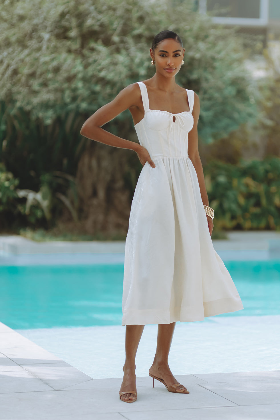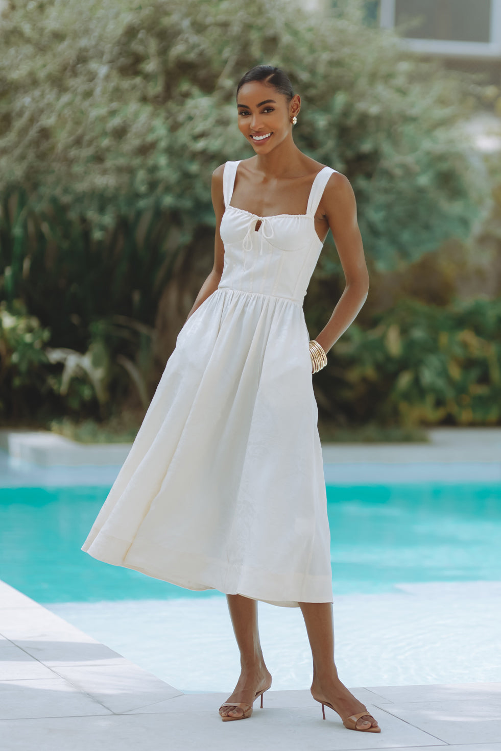Graceful and refined, the Sancia Corset Midi Dress is cut from luxurious ivory jacquard with a subtle textured sheen. Featuring a structured corset bodice with a delicate tie-front detail, wide straps, and a flattering A-line silhouette, it blends elegance with ease. The smocked back ensures a comfortable fit, while a waist tie enhances feminine shape. Perfect for bridal showers, garden soirées, or romantic evenings, this timeless midi exudes effortless sophistication.